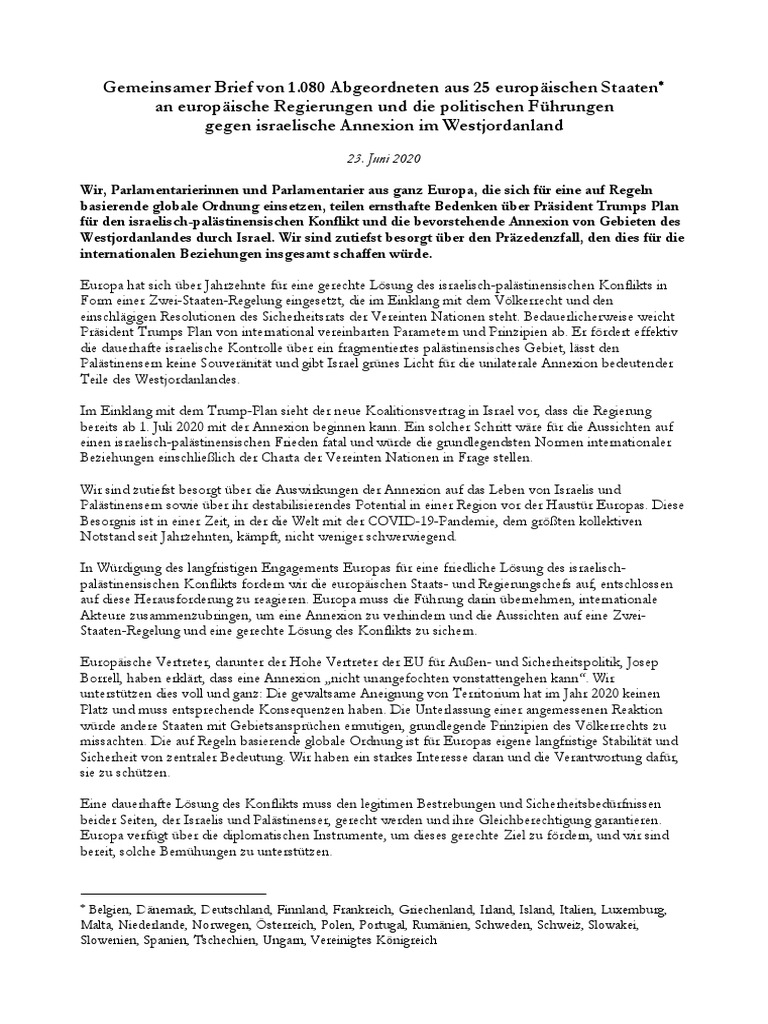 Gemeinsamer Brief Von 1 080 Europaischen Abgeordneten Gegen Israelische Annexion Im Westjordanland